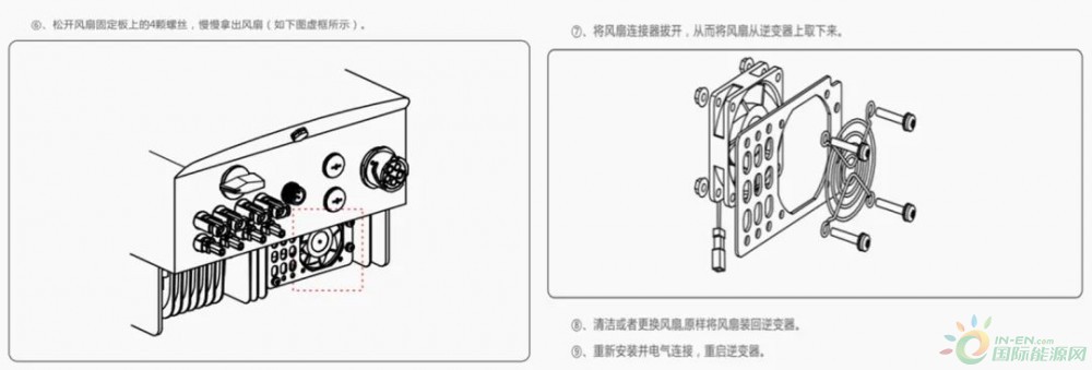 光伏逆變器普遍安裝于戶外,受日曬、雨淋、沙塵或高溫等自然因素影響,因此,光伏逆變器的散熱性能成了影響逆變器穩(wěn)定可靠運(yùn)行的主要因素之一。逆變器的散熱方式有兩種:一是采用自然散熱,即依靠自身散熱器散熱,二是輔以散熱風(fēng)扇,依靠外力強(qiáng)制冷卻。正值高溫酷暑,良好的散熱性能是逆變器高效發(fā)電、可靠運(yùn)行的關(guān)鍵,但置于外部環(huán)境中的逆變器有許多因素會影響散熱風(fēng)扇運(yùn)行,因此定期維護(hù)有利于逆變器的正常運(yùn)行。本期小課堂為大家分享逆變器散熱風(fēng)扇維護(hù)相關(guān)問題。