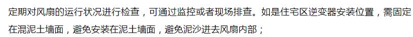 要保障逆變器散熱風(fēng)扇正常運(yùn)行,前期合理的安裝和后期排查運(yùn)維必不可少,首先需要避免有異物積累的安裝環(huán)境或者添加保護(hù)機(jī)制,并定期通過監(jiān)控和現(xiàn)場排查及時清理和更換風(fēng)扇,以保障逆變器正常運(yùn)行。