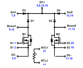 上圖為該全碳化硅功率模塊的內(nèi)部電路拓撲,模塊內(nèi)部由兩個相互獨立升壓級和一個熱敏電阻構成,其中MOSFET采用的是耐壓等級為1200V,導通電阻為40mΩ的碳化硅MOSFET。在各個升壓級處還包含了一個1200V/40A碳化硅升壓二極管,以及兩個1200V/50A的旁路整流器用于控制浪涌電流。在該電路中引入全碳化硅的功率器件,能夠使該集成模塊支持更高的開關頻率和更低的導通電阻,實現(xiàn)降低開關損耗,將電源轉換的能效實現(xiàn)最大化。同時更高的開關頻率有助于減小光伏逆變器的體積與設計成本。