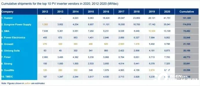 (2012-2020年全球前十逆變器供應(yīng)商的出貨數(shù)據(jù)統(tǒng)計。來源:伍德麥肯茲)