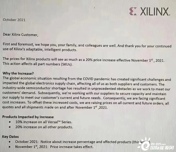 意法半導(dǎo)體表示,將在今年最后一個季度提高所有產(chǎn)品價格,包括現(xiàn)有庫存;安森美則是從10月初開始,對部分產(chǎn)品漲價生效,新價格將適用于新訂單和現(xiàn)有積壓訂單;此外,賽靈思也發(fā)布通知稱,將會提高2021年11月1日及之后所有當(dāng)前和未來的訂單、所有報價和所有發(fā)貨的價格。