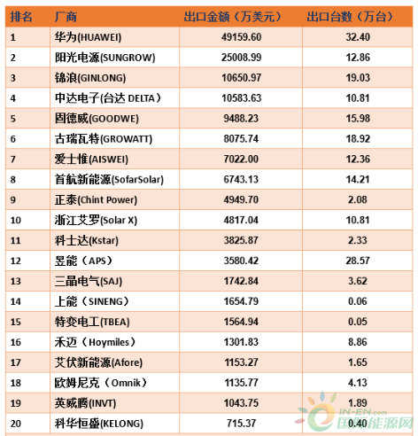 逆變器出口TOP 20:華為、陽(yáng)光、錦浪領(lǐng)銜,固德威、古瑞瓦特、三晶等上榜