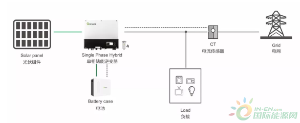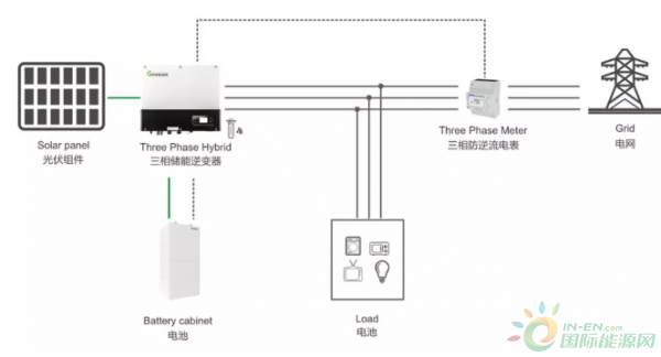 2 加裝儲能裝置 加裝防逆流裝置,成本比較低,但會浪費一些光伏發電,適合于短時間小功率的系統,如果光伏裝機大于負載功率,或者長時間大于負載功率,建議使用儲能裝置。如下圖所示,系統由光伏組件,儲能逆變器、蓄電池、電流傳感器、負載等組件,當檢測到有電流流向電網時,啟動雙向變流器,把多出的電能儲存在蓄電池中,等需要時再放出來。