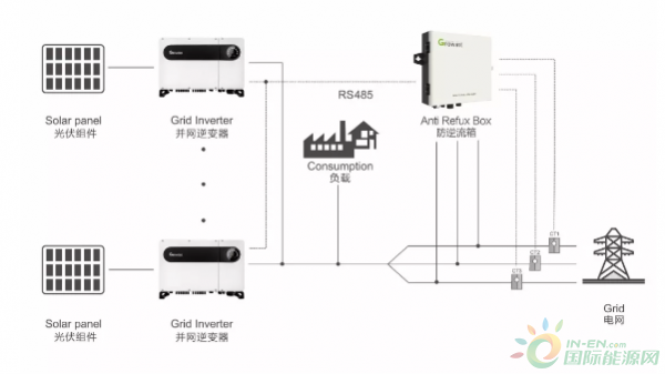 目前行業內有兩種解決方案:一是加防逆流裝置,在并網點安裝電表或者電流傳感器,當檢測到有電流流向電網時,降低逆變器輸出功率;二是加裝儲能裝置,也是在并網點安裝電表或者電流傳感器,當檢測到有電流流向電網時,逆變器輸出功率不變,啟動雙向變流器,把多出的電能儲存在蓄電池中,等光伏功率下降或者負載功率增大時再放出來。
