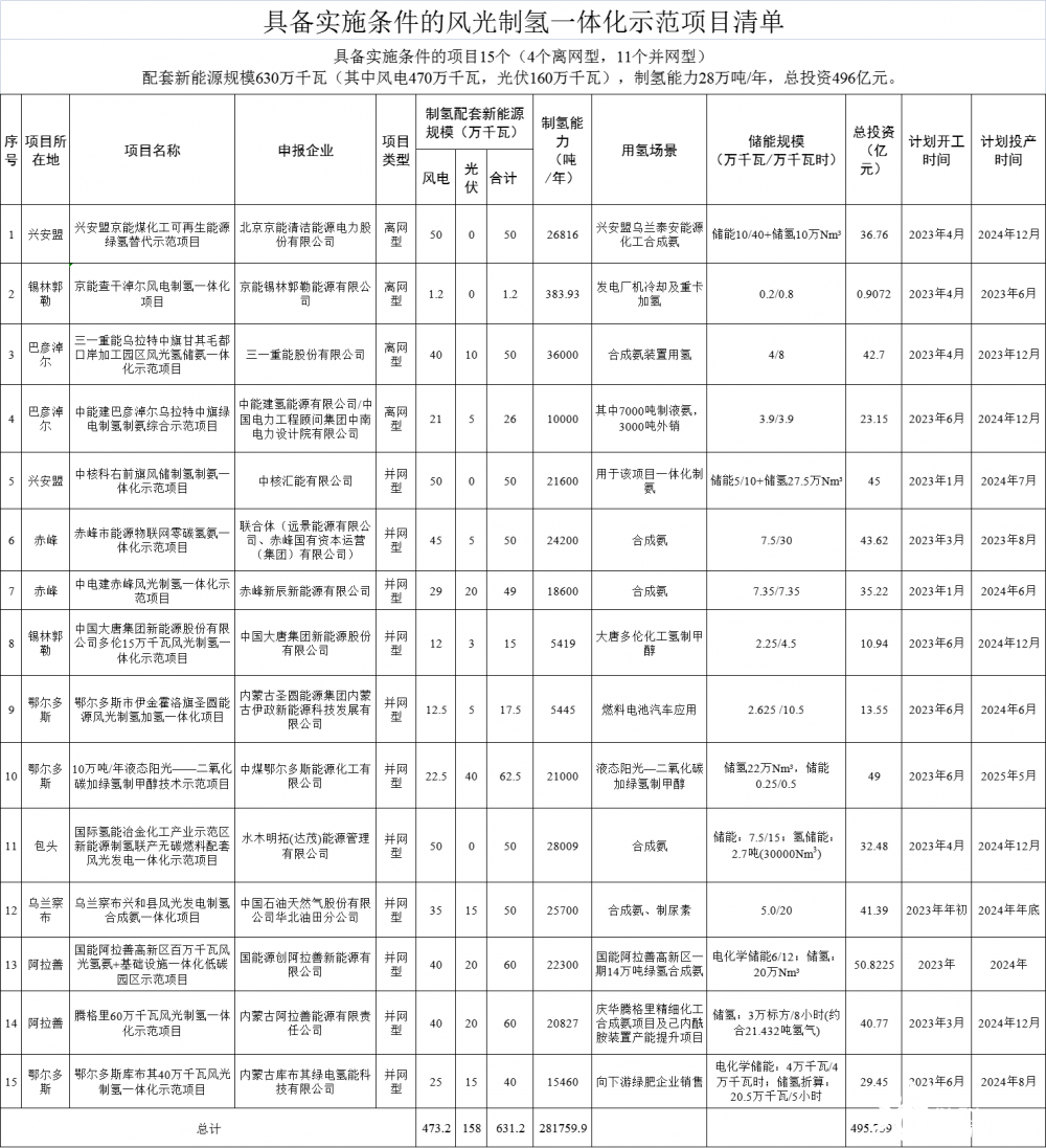 通知顯示:按照《內蒙古自治區人民政府辦公廳關于促進氫能產業高質量發展的意見》和《內蒙古自治區風光制氫一體化示范項目實施細則(2022年版)》有關要求,經自治區人民政府同意,計劃實施興安盟京能煤化工可再生能源綠氫替代示范項目等15個風光制氫一體化示范項目。具備實施條件的項目15個(4個離網型,11個并網型),配套新能源規模631.2萬千瓦(其中風電473.2萬千瓦,光伏158萬千瓦),制氫能力28.2萬噸/年,總投資495.8億元。