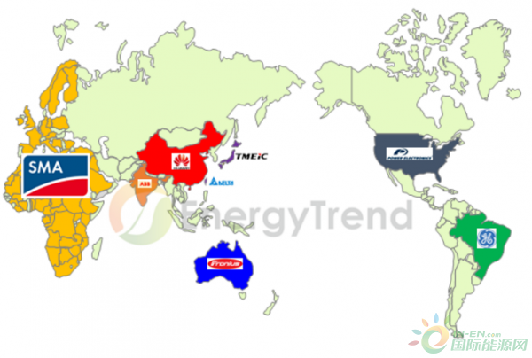2018年全球各區域市場偏好的逆變器品牌 SMA普遍在EMEA(Eurpoe, Middle East, Africa)市場中獲得青睞;中國市場中首選仍就是華為,雖然在海外面臨中美貿易戰的威脅,但在中國仍舊是逆變器龍頭;美國市場則偏好西班牙廠商Power Electronics,主要仍是在大型電站項目上拔得頭籌;印度市場仍是ABB天下; 澳洲市場以奧地利廠商Fronius為主;巴西市場則是GE;日本市場則是日本品牌TMEIC為主;臺灣市場則是以臺灣品牌臺達為首選。