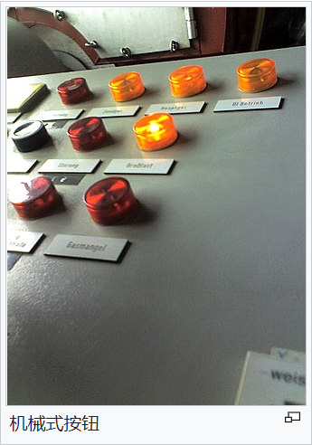 按鈕也稱為按鍵,是一種電閘(switch,或稱開關(guān)),用來控制機(jī)械或程序的某些功能。一般而言,紅色按鈕是用來使某一功能停止,而綠色按鈕,則通常可開始某一項功能。按鈕的形狀通常是圓形或方形。