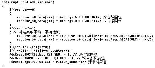 主要完成線電流采樣和線電壓采樣。為確保電壓與電流信號間沒有相對相移,本部分利用TMS320F28335片上ADC的同步采樣方式。為提高采樣精度,在A/D中斷子程序中采用均值濾波的方法。 對A相電壓和電流A/D的同步采樣部分代碼如下: