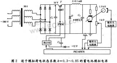 上面討論的是荷電狀態(tài)系數(shù)k=0.3~0.85所對應(yīng)的情況,在這一區(qū)間內(nèi),可認(rèn)為蓄電池的內(nèi)阻Ri是常數(shù)。對于k<0.3的情況,隨k值的下降,內(nèi)阻Ri會急劇上升。這一狀態(tài)也可由模擬電源近似模擬:使開關(guān)管T1的PWM脈寬隨k值一起下降,一方面造成電壓的下降,同時由于也使整個線路的開關(guān)損耗增大,這相當(dāng)于增加了蓄電池的內(nèi)阻。不過這樣得到的Ri值與蓄電池的實際內(nèi)阻可能有相當(dāng)?shù)牟罹?,因此k<0.3的情況不適宜使用。