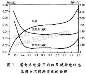 蓄電池的電勢E、內(nèi)阻Ri與電池的荷電狀態(tài)有關(guān)。荷電以系數(shù)k表示,其值在0~1之間,0代表未荷電,1代表滿荷電。隨荷電系數(shù)k由0上升,蓄電池電勢非線性地增大,內(nèi)阻Ri則呈現(xiàn)先下降最后又略有升高的形狀,如圖1所示。由圖1可見,蓄電池內(nèi)阻Ri的充、放電曲線亦有差別。起動機每起動一次,荷電狀態(tài)系數(shù)k均會下降百分之幾,變化量很??;而蓄電池電勢E(k)的變化則視k之值而異。當(dāng)k在0.3~0.85范圍內(nèi)時,起動機每起動一次E(k) 變化很小,接近恒值,但當(dāng)k>0.85和k<0.3時,隨k值的小變化,E(k)變化較為明顯。在設(shè)計蓄電池模擬電源控制軟件時應(yīng)予以考慮。